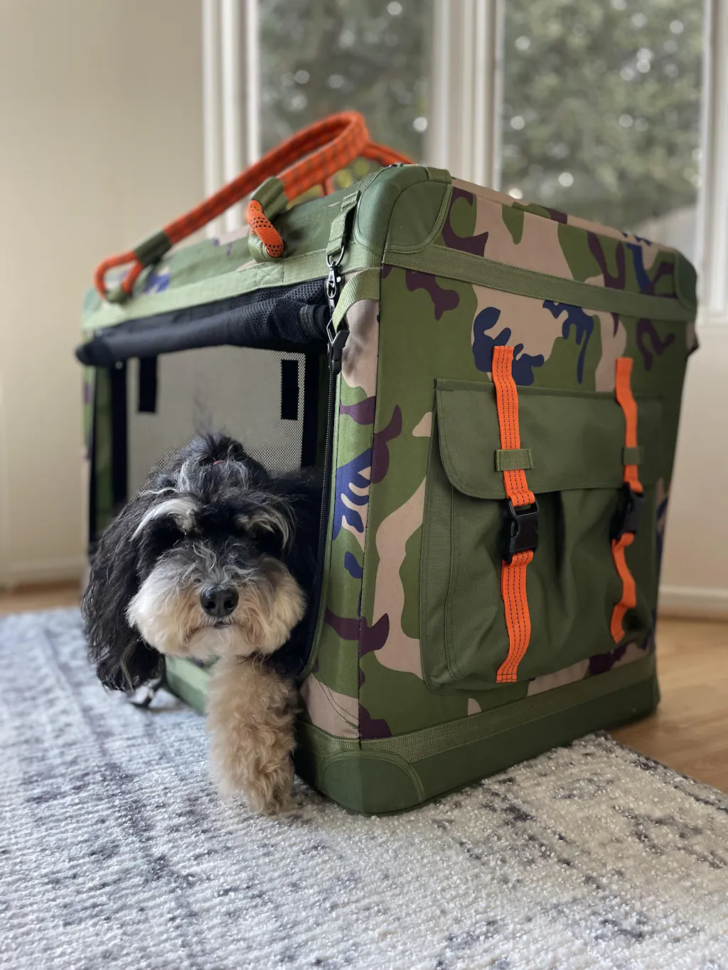 Another fabulous Roverlund product, we love the quality and design . I got the large camo -fits our doodette’s personality - to use mostly with agility activities, it takes less than 3 minutes to set up and fold back to a portable item, easy to carry away while holding your dog on a leash, saves trips to the car !