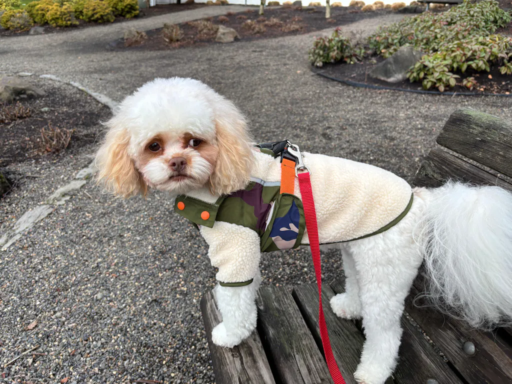 The jacket is super cute. I like the herness is under the jacket. My Cavapoo weighs 13 lb and size M fits well. I also bought the pink pet carrier recommended by my friend. It's well made and great for travel in the car and plane.